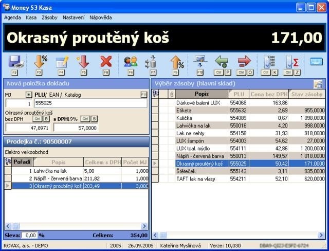 Systém Money S3 Kasa je samostatný program, který slouží k přímému maloobchodnímu prodeji na pokladně. Je maximálně přizpůsoben rychlému prodeji zásob, se zvláštním zřetelem na ovládání pouze pomocí klávesnice (všechny funkce potřebné k prodeji lze vyvolat pomocí klávesových zkratek).